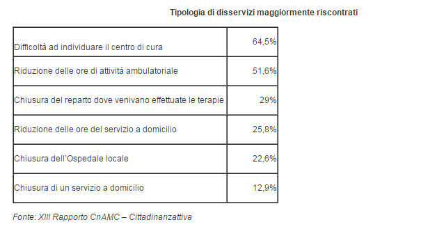 Inefficienze e disservizi sanitari ormai sotto gli occhi di tutti e, nello stesso tempo, costi sempre più alti per i pazienti. I cittadini lamentano ritardi nella diagnosi, difficoltà ad accedere ad alcuni esami a causa del ticket, riduzione dei servizi soprattutto a livello ospedaliero e ambulatoriale. Pesano inoltre i problemi legati alla conciliazione della malattia con il lavoro, sia per il paziente che per la famiglia che l’assiste.