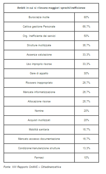 La sensazione generale è che le inefficienze la facciano da padrone: nel 2013 il 77% delle associazioni dichiara di averne riscontrate, innanzitutto determinate dalla burocrazia inutile (80%), dalla cattiva gestione e allocazione delle risorse umane (66,7%) alle prese con il blocco del turn over, dalla organizzazione inefficiente dei servizi (50%).