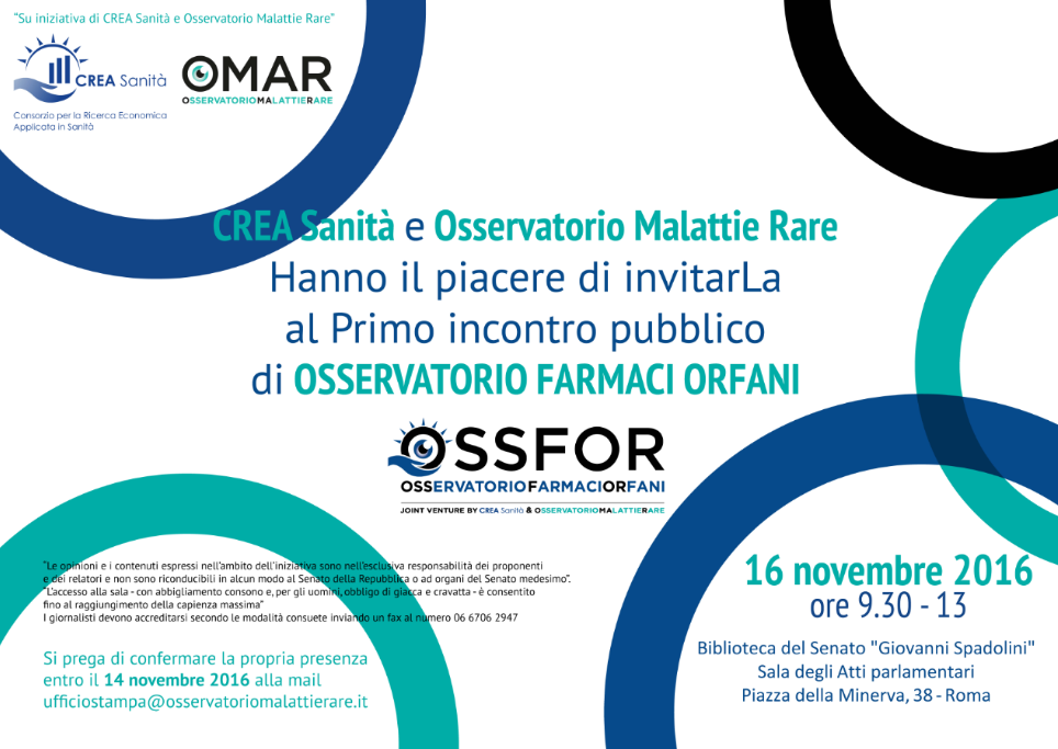 Si terrà il 16 novembre 2016, dalle ore 9.30 alle 13, presso la Biblioteca del Senato Giovanni Spadolini (Sala degli Atti Parlamentari, Piazza della Minerva, 38 – Roma) il Primo incontro pubblico di Osservatorio Farmaci Orfani, dal titolo “La sfida della sostenibilità per i farmaci orfani”, organizzato da Crea Sanità e Osservatorio Malattie Rare.