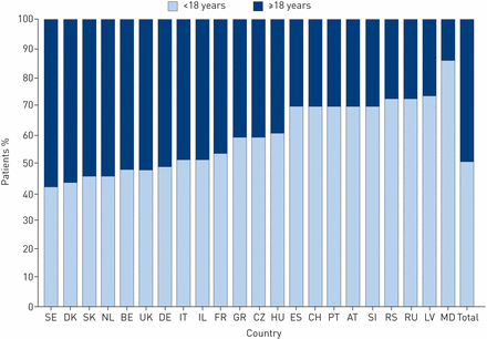 Nel grafico è rappresentata la proporzione fra adulti ≥ 18 anni e bambini < 18 anni con fibrosi cistica in vita al 31 dicembre 2010". La fonte del grafico è la European Cystic Fibrosis Society.