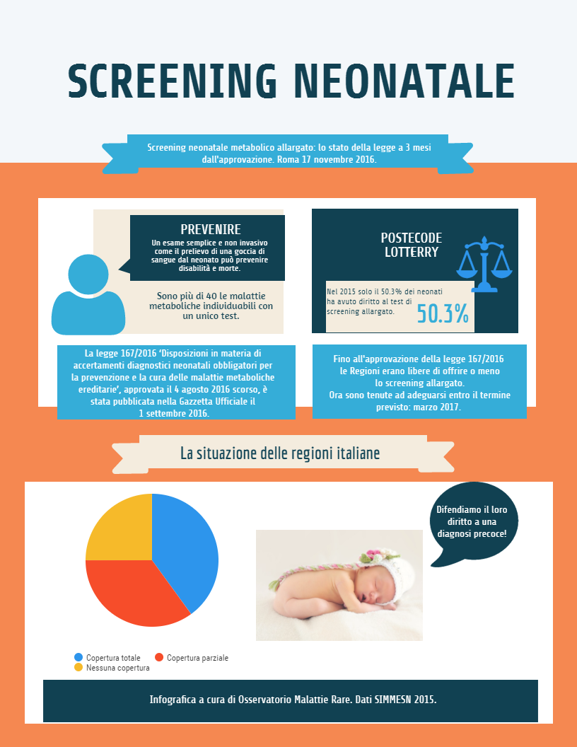 È stato pubblicato in Gazzetta Ufficiale il Decreto Ministeriale DECRETO 13 ottobre 2016 “Disposizioni per l'avvio dello screening neonatale per la diagnosi precoce di malattie metaboliche ereditarie” , Decreto di attuazione dell’art. 1 comma 229 della Legge di Stabilità per il 2014. Tale atto era necessario affinché non andassero persi i fondi precedentemente stanziati e mai utilizzati, fondi che andranno a confluire in quelli necessari all’applicazione della Legge 167/2016, che sancisce l’obbligatorietà dello screening metabolico allargato per le malattie rare metaboliche su tutto il territorio nazionale. Il Decreto stabilisce lo stanziamento dei fondi necessari (10 milioni di euro per il 2015 e 2016), il panel delle malattie da screenare, le modalità del consenso informato (che però con la legge 167/2016 non sarà necessario) e le modalità di gestione dello screening stesso, compresa la presa in carico dei neonati che risultassero positivi al test e il trattamento dei dati sensibili e dei campioni biologici degli stessi.